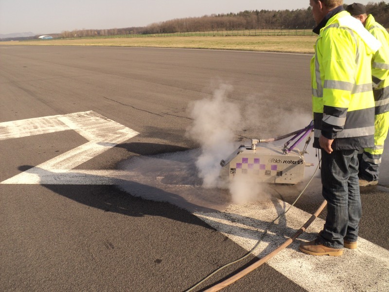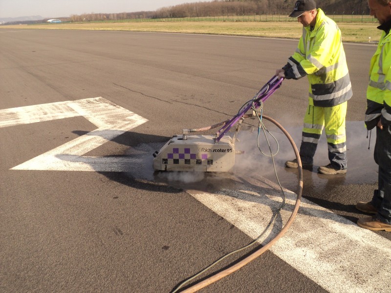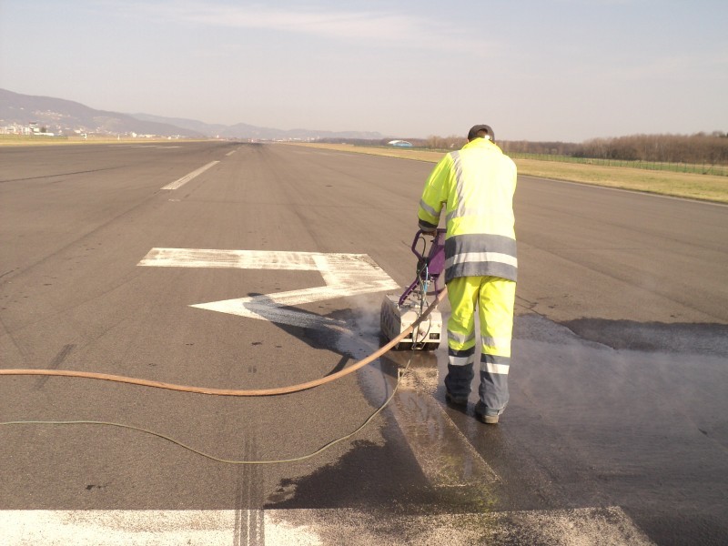 Odstranjevanje talne signalizacije na letaliških stezah zahteva posebne prijeme, saj je zelo zahtevno. To pa zato, ker letališča uporabljajo barve posebne kvalitete (rumene za začasne oz bele za stalne), ki morajo imeti tudi ustrezen certifikat.