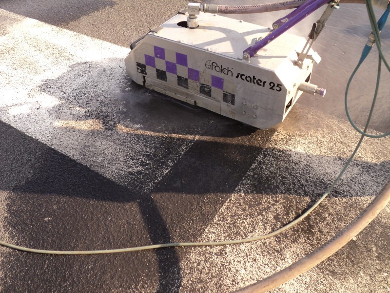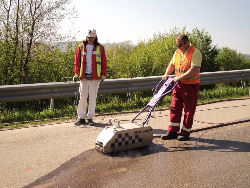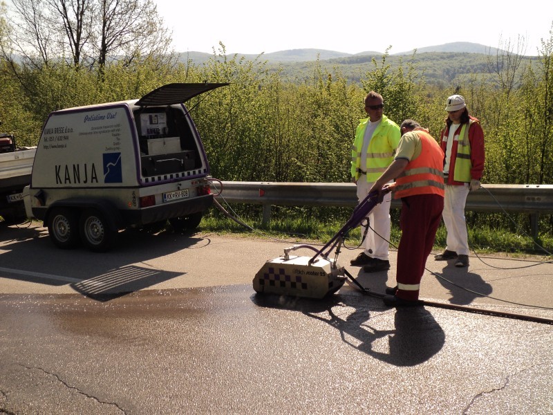 Izvedba odstranjevanja veznega sredstva bitumna v asfaltu ali cementa v betonu, omogoča povečanje drsnosti vozišča. Z izvedbo z vodnimi noži (z vodo) lahko z odstranjevanjem vezivnega sredstva in različne umazanije (odstranimo le nekaj milimetrov), ki nastane ob uporabi vozišča v asfaltni ali betonski izvedbi vozišče osvežimo, ga obnovimo in mu povrnemo potrebno hrapavost. Izvedba novega vozišča narekuje SRT v višini 80. Z izvedbo hrapavosti z vodnimi noži na »starem« vozišču po posegu izvedbe sanacije dosegamo enake vrednosti. Iz tega razloga ni potrebe po novih preplastitvah, stroški vzdrževanja ceste se bistveno zmanjšajo, varnost udeležencev v prometu se pa bistveno poveča. Pri mokrem in gladkem vozišču je namreč velika nevarnost nastanka »vodnega filma«, ki zelo hitro privede do zdrsa vozil in je velikokrat glavni vzrok prometne nesreče. Naša tehnologija nam omogoča izvedbo obnove vozišča v enkratni izvedbi v širini od 20 cm do maksimalne širine 250 cm (za večje površine).