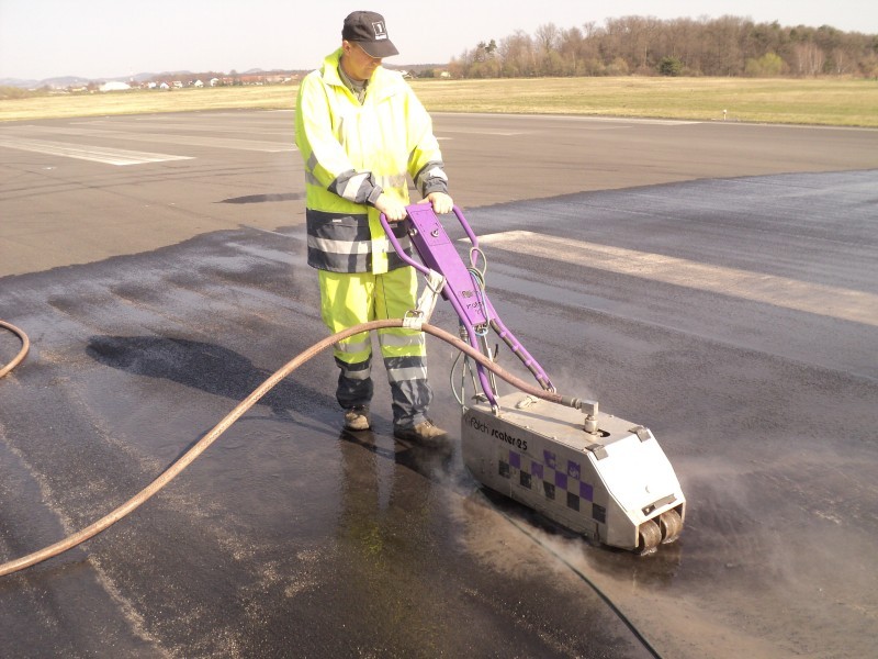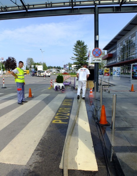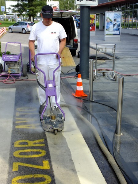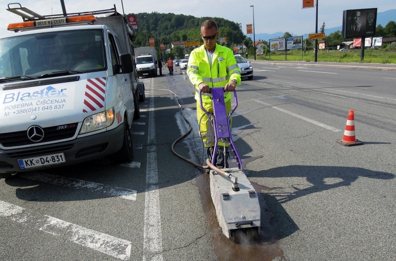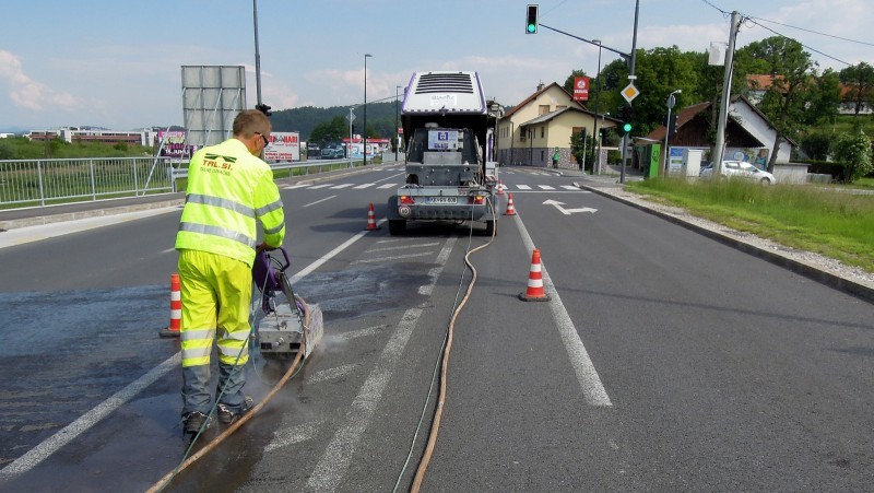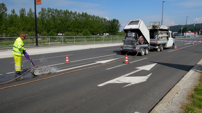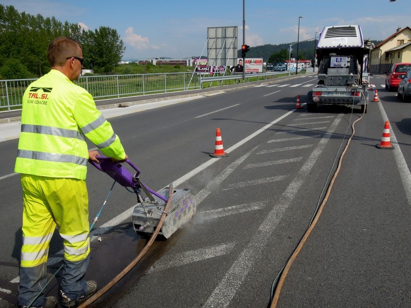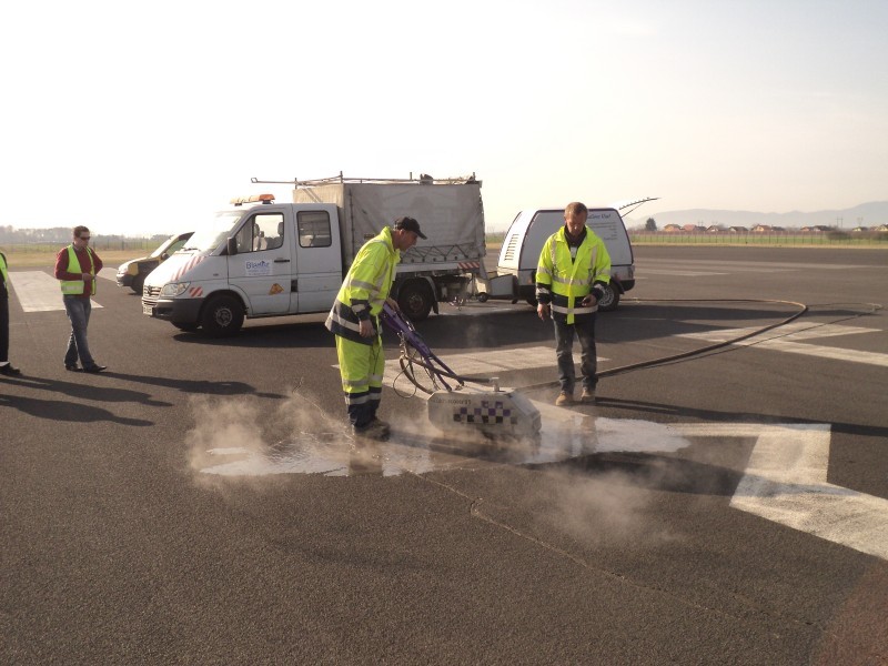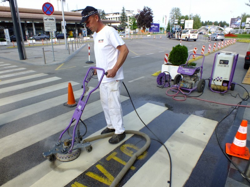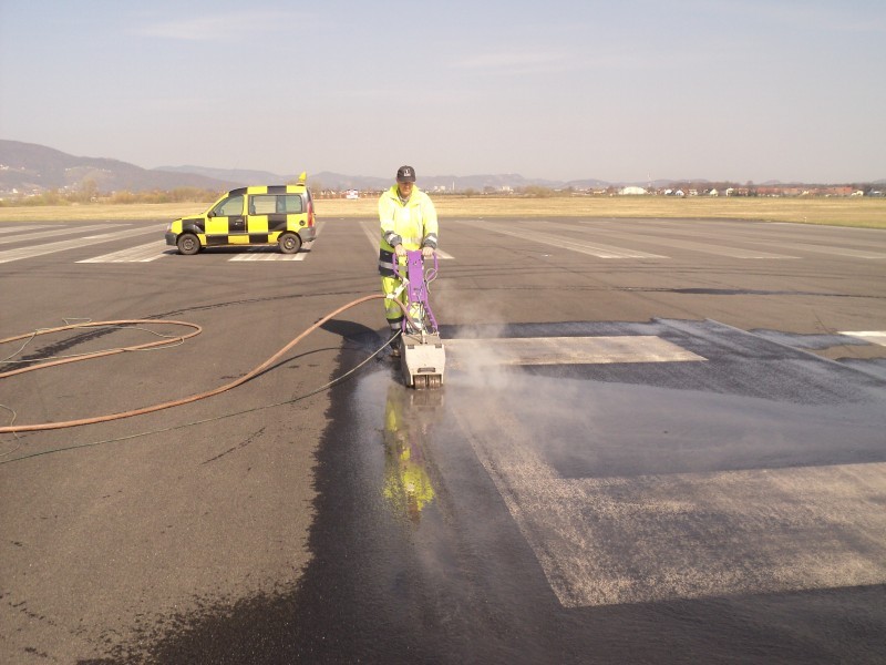 Tudi tu je naša oprema v pomoč! Učinkovita digitalna nastavitev pritiska curka vodnih nožev nam omogoča odstranjevanje v debelini in dimenziji, ki jo želimo. Odstranimo lahko le talno signalizacijo, brez da poškodujemo izvedeno prevleko ali asfalt. Pri odstranjevanju pa ne samo da asfalt ostane nepoškodovan, tudi antizdrsna površina ostane skoraj nepoškodovana. Ni torej nobene potrebe po sanaciji proti drsne površine. Vsak drug način (z hlajenim vodikom, mehanskim frezanjem ali podobno) bi zahtevalo naknadno sanacijo asfalta in proti zdrsne površine. Odstranjevanje z vodo, pomeni tudi velik prihranek denarja zaradi kasnejše sanacije, pomeni hitro in učinkovito izvedbo pomeni pa tudi tiho in učinkovito izvedbo. Odstranjevanje talne signalizacije smo delali na letališču Cerklje, naročnik je bil zelo zadovoljen. Popravkov antiskida pa ni bilo potrebno.