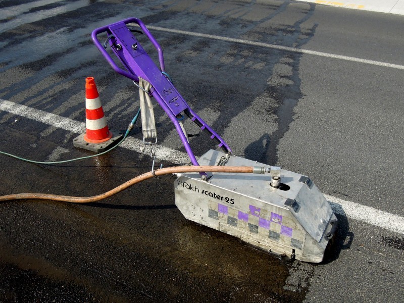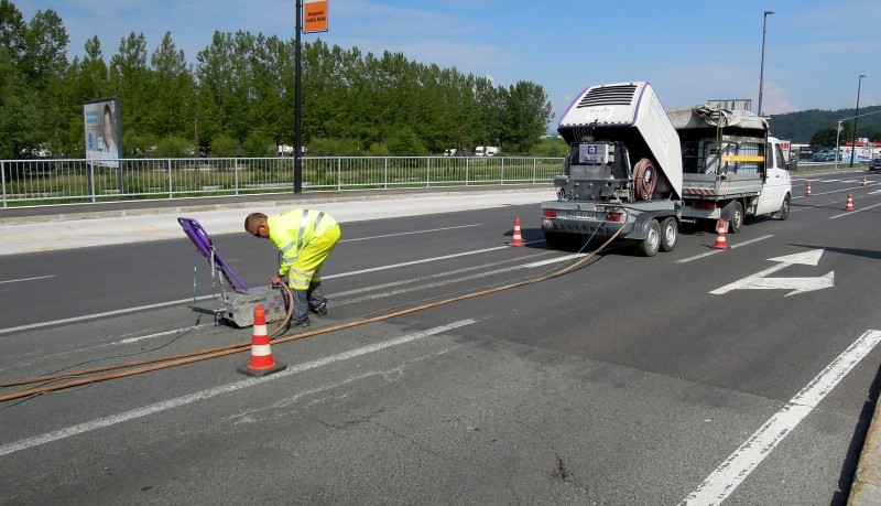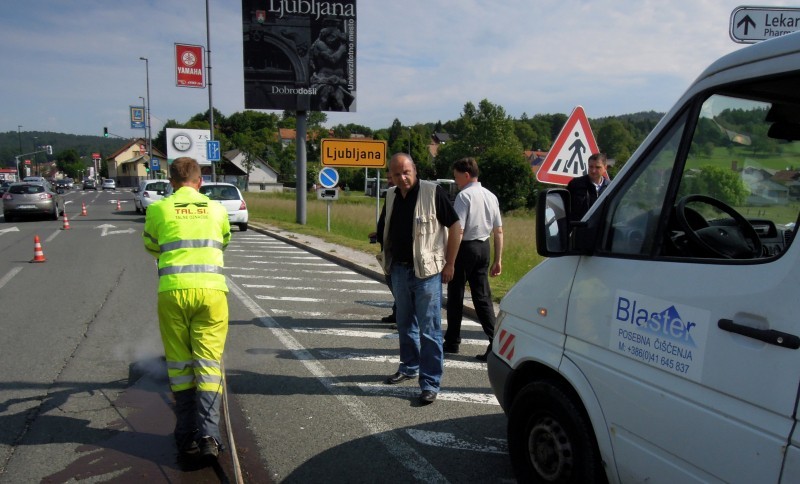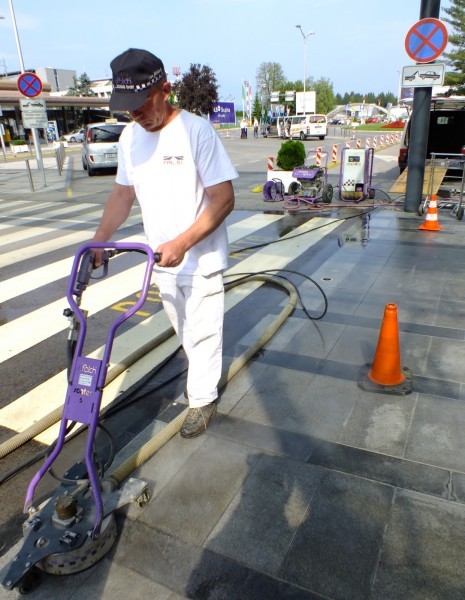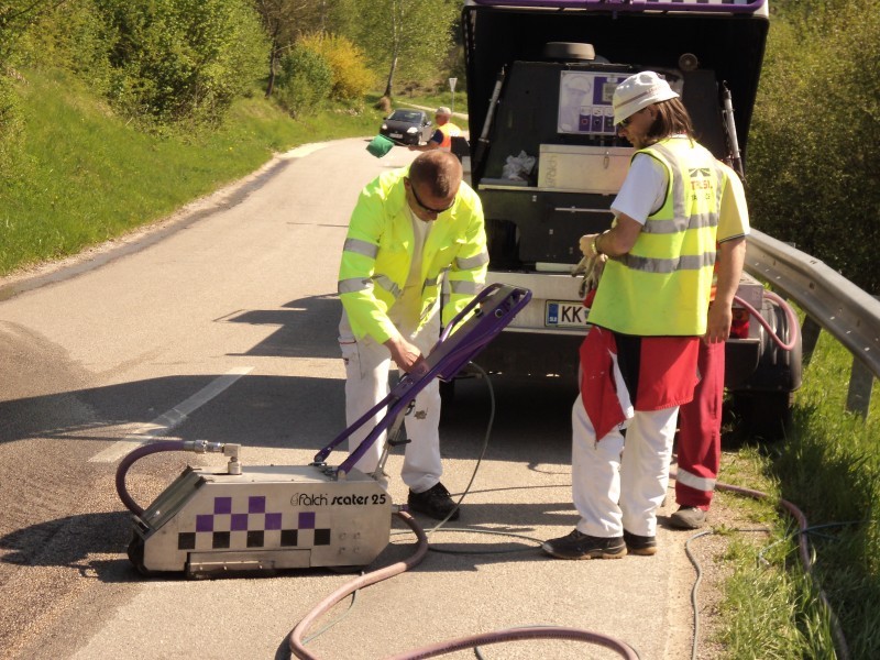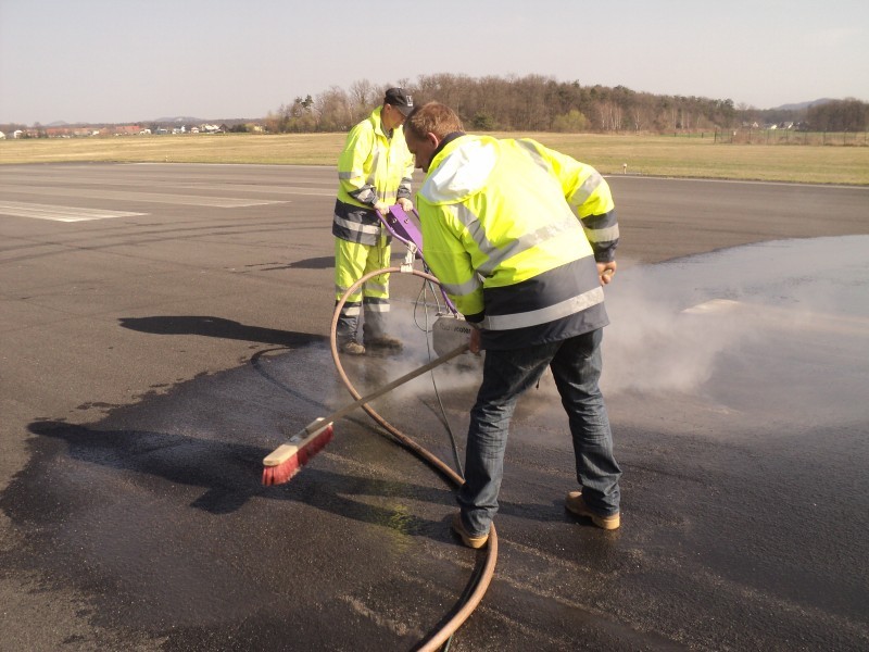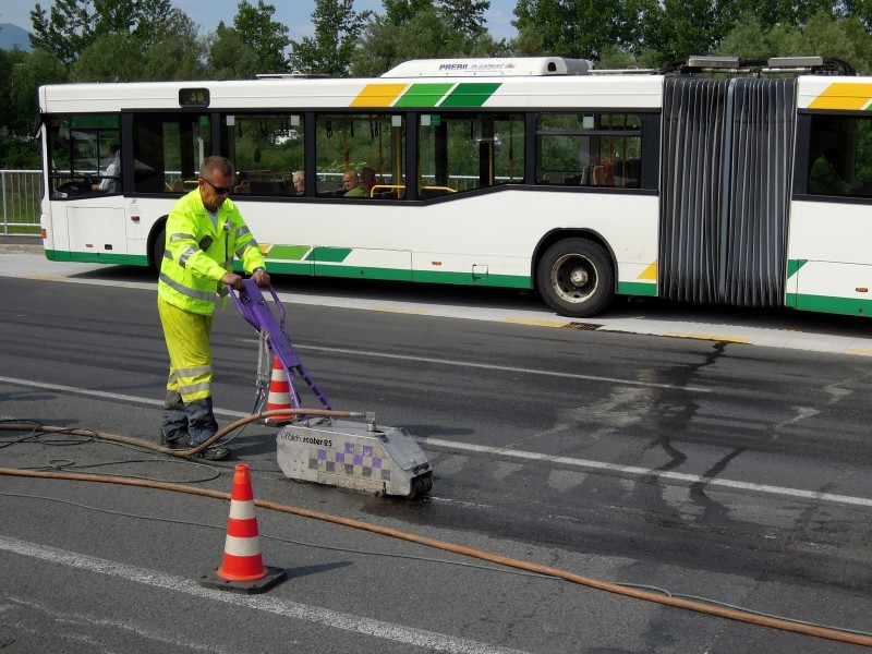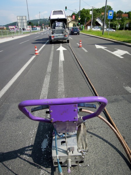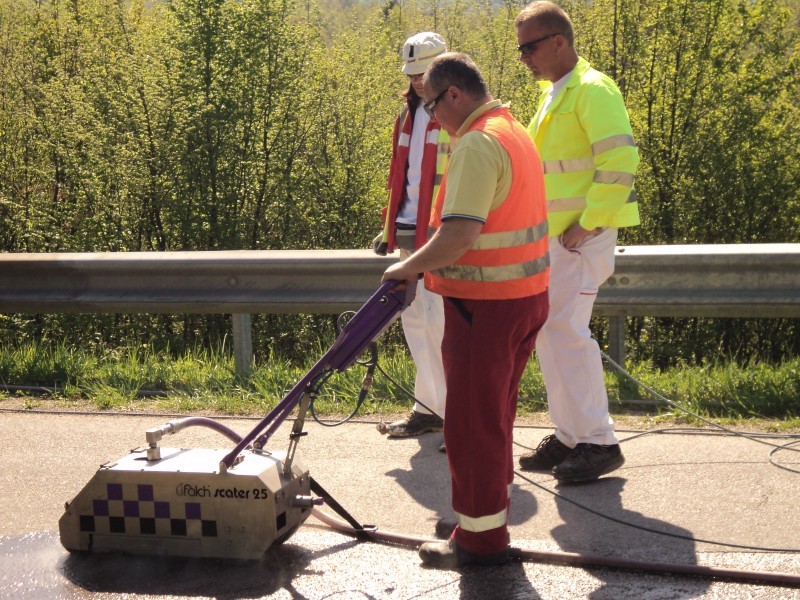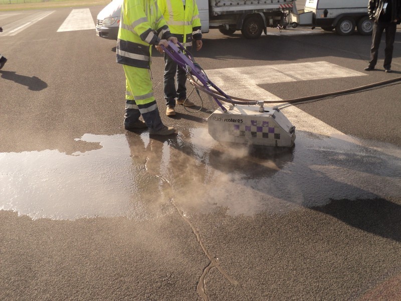 Tudi tu je naša oprema v pomoč! Učinkovita digitalna nastavitev pritiska curka vodnih nožev nam omogoča odstranjevanje v debelini in dimenziji, ki jo želimo. Odstranimo lahko le talno signalizacijo, brez da poškodujemo izvedeno prevleko ali asfalt. Pri odstranjevanju pa ne samo da asfalt ostane nepoškodovan, tudi antizdrsna površina ostane skoraj nepoškodovana. Ni torej nobene potrebe po sanaciji proti drsne površine. Vsak drug način (z hlajenim vodikom, mehanskim frezanjem ali podobno) bi zahtevalo naknadno sanacijo asfalta in proti zdrsne površine. Odstranjevanje z vodo, pomeni tudi velik prihranek denarja zaradi kasnejše sanacije, pomeni hitro in učinkovito izvedbo pomeni pa tudi tiho in učinkovito izvedbo. Odstranjevanje talne signalizacije smo delali na letališču Cerklje, naročnik je bil zelo zadovoljen. Popravkov antiskida pa ni bilo potrebno.